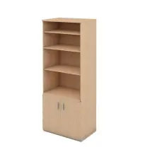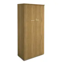 Armário alto com tampo encabeçado de 40 mm e corpo em MDP de 15 mm, duas portas de abrir, interior com 2 prateleiras móveis, 1 fixa e capacidade 15 quilos por prateleira.