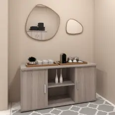 Armário baixo com porta de correr, tampo confeccionado em MDP de 25 mm, corpo confeccionado em MDP de 18 mm e rodapé metálico tubular.