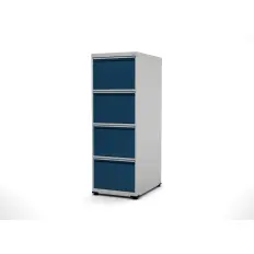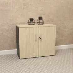 Armário charuto alto com armário e prateleira na parte superior, tampo confeccionado em BP de 25 mm, portas e corpo confeccionados em BP de 15 mm e rodapé em estrutura tubular metálica com nivelador de altura.