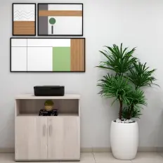 Armário de correr com puxadores tipo barra, tampo confeccionados em MDP de 25 mm, corpo confeccionado em MDP de 18 mm e fechadura trancando as duas portas simultaneamente.