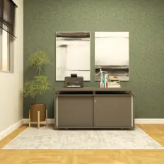 Armário Sedute de alto padrão com tampo em MDF de 10 mm revestido na face superior em lâmina em madeira pré composta envernizada, com estrutura metálica, duas portas de correr e vão central,