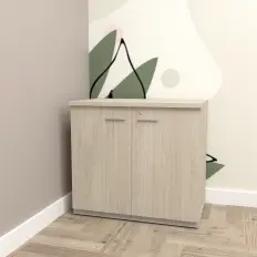 Armário médio aberto com 2 prateleiras, tampo confeccionado em MDP de 25 mm, corpo confeccionado em MDP de 15 mm e rodapé em estrutura tubular metálica com nivelador de altura.
