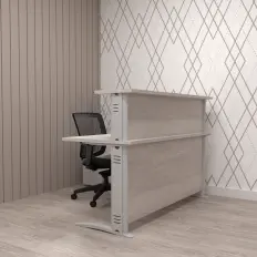 (Foto meramente ilustrativa) Balcão de atendimento em L com tampos confeccionados em MDP de 25mm revestido em melamínico BP, acabamento filetado. Pés em MDP de 25mm com calha central para passagem de fiação, painel frontal em MDP de 18mm. Pé central metálico formado por chapa de aço dobrada com calhas removíveis na parte interna. Medidas: 1400mm x 1400mm x 1100mm (largura x profundidade x altura). Verifique outras opções com nossos consultores.