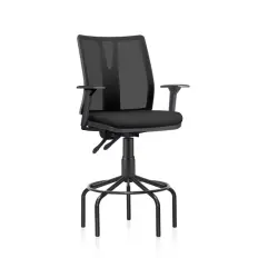 Banqueta alta Quic com assento e encosto em polipropileno com acabamento em pintura eletrostática à pó, assento estofado e base confeccionada em aço.