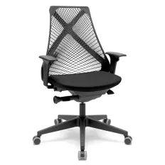 Poltrona presidente Air com assento revestido, encosto e apoio de cabeça em tela, base piramidal com mecanismo ergonômico e braços com regulagem de altura.
