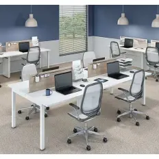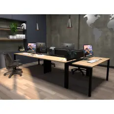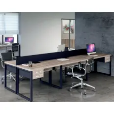 Posto de trabalho para call center com estrutura regulável confeccionada em aço carbono com variação de altura independente dos tampos (frontal e posterior), engrenagens do mecanismo confeccionadas em aço carbono e PVC, pés tubulares, tampo bipartido sem consulta constituído em MDP de 2 5mm revestido em melamínico BP, borda frontal boleada 180 graus e fita de 2mm nos demais lados. Laterais retas e fundo em MDP de 25mm com abafadores revestidos em tecido.