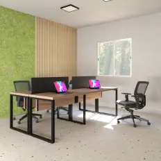 Posto de trabalho call center com estrutura com regulagem na altura (frontal e posterior). Tampo e corpo confeccionados em MDP de 25 mm, laterais e fundo com abafadores revestidos no tecido. Este item atende as normas da NR17.