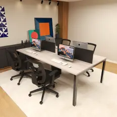 Estação de telemarketing de 4 lugares com tampos, laterais e fundos confeccionados em MDP de 15mm E acabamento em perfil 180 graus nas bordas de contato.