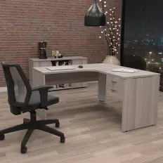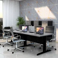 Estação de telemarketing dupla de 8 lugares com tampos, laterais e fundos confeccionados em MDP de 15mm e acabamento em perfil 180 graus nas bordas.