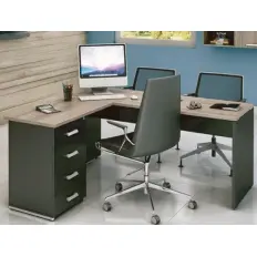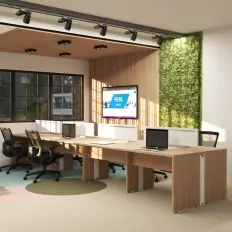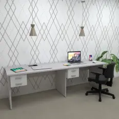 Estação de trabalho de 2 lugares composto por 2 mesas delta pés paineis. Tampos e pés das mesas confeccionados em em MDP de 25 mm, pé central de aço em formato octogonal com furação para acoplar dispositivo de kit de energia e biombo divisor confeccionado em MDP de 15 mm entre as mesas.