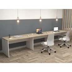 Estação de trabalho de 2 lugares com gaveteiro fixo de duas gavetas, composto por 2 mesas delta pés paineis. Tampos e pés das mesas confeccionados em em MDP de 25 mm, pé central de aço em formato octogonal com furação para acoplar dispositivo de kit de energia e biombo divisor confeccionado em MDP de 15 mm entre as mesas.