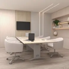 Mesa de reunião oval com tampo confeccionado em MDP de 25 mm, saia confeccionada em MDP de 15 mm e pés confeccionados em aço com calha sacavel e subida de fiação.
