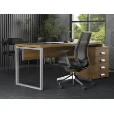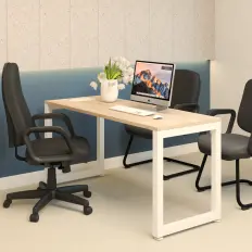 Mesa de reunião oval com tampo e rettaguardas confeccionados em MDP de 15 mm com perfil em PVC e pés confeccionados em aço com acabamento central em MDP de 15 mm.