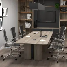 Mesa redonda com tampo confeccionado em MDP de 15 mm com perfil em PVC e pés confeccionados em aço com niveladores de altura.