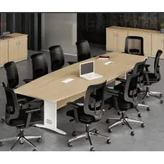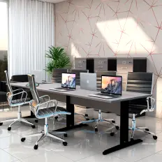 Mesa para reunião modelo retangular com tampo e pés confeccionados em MDP de 25 mm e retaguarda confeccionada em MDP de 15 mm.