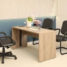 Mesa delta para escritório com tampo confeccionado em BP de 25 mm com fita de borda de 2 mm, saia confeccionada em BP de 15 mm, pés confeccionados em aço com calha sacavel, subida de fiação e niveladores de altura. Medidas: 1450 x 1300 x 740 mm (largura esquerda x largura direita x altura).