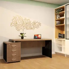 Mesa diretiva com armário lateral. Tampo da mesa encabeçado confeccionado em MDP de 40 mm, pés confeccionados em MDP de 40 mm com niveladores de altura. Armário lateral com 1 porta de abrir, 3 gaveteiros, sendo 1 para pasta suspensa e nicho lateral. Tampo do armário confeccionado em MDP de 25 mm com recorte para caixa de tomada e corpo confeccionado em MDP de 15 mm.