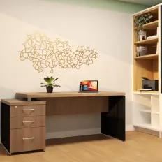 Mesa em L com tampo confeccionado em MDP de 25 mm, gaveteiro fixo de duas gavetas e pés trave de aço com niveladores de altura.