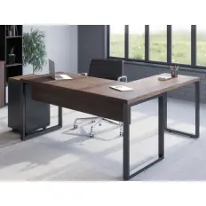 Mesa em L com pé gaveteiro de quatro gavetas, tampo e pés confeccionados em MDP de 25 mm e saia confeccionado em MDP de 15 mm.