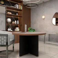 Conjunto de mesas em formato de L com tampos confeccionados em MDP de 15 mm com acabamento em perfil de 180 graus, pés confeccionados em aço com acabamento central em MDP de 15 mm com niveladores de altura.