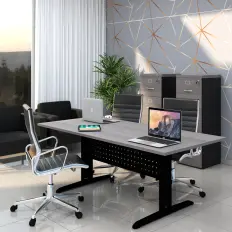 Mesa de reunião retangular com tampo confeccionado em MDP de 25 mm com caixa de tomada, saia confeccionada em MDP de 15 mm e pés confeccionados em aço com calha sacável e subida de fiação.