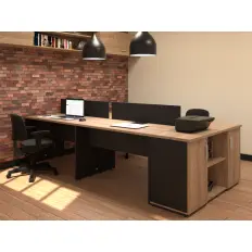 Plataforma de trabalho dupla para 4 lugares com armário de correr na ponta. Tampo principal confeccionado em MDP de 25 mm, biombo central confeccionado em MDP de 25 mm, estrutura em aço carbono,tampo central com recorte para moldura de caixa de tomada basic "M" confeccionado em MDP de 25 mm e pés tubulares de 50 x 50 mm em aço carbono.