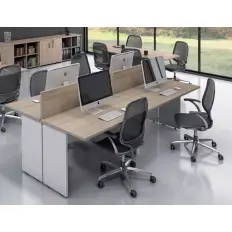 Plataforma de trabalho dupla para 4 lugares. Tampos confeccionados em MDP de 25 mm, moldura de aço no tampo para acesso a fiação, pés cavalete e estrutura em tubos de aço de 50 x 50 mm e divisória central em madeira com friso.