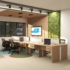 Plataforma de 4 lugares com painel divisor central, gaveteiro fixo de duas gavetas, tampo confeccionado em MDP de 40 mm, pés de aço com niveladores de altura e moldura de plástico para acesso a fiação.