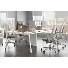 Plataforma de 4 lugares com gaveteiro fixo de duas gavetas por lugar e painel divisor central. Tampo confeccionado em MDP de 25 mm, pés de aço com niveladores de altura e moldura de plástico para acesso a fiação.
