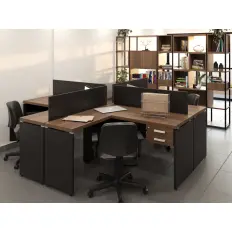 Plataforma de trabalho dupla de 4 lugares com painel divisor, tampo confeccionado em MDP de 25 mm com moldura de plástico para acesso a fiação , pé painel em MDP de 15 mm com niveladores de altura e armário credence na ponta.