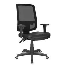 Poltrona Slep presidente com assento revestido, encosto e apoio de cabeça em tela, base standard com mecanismo ergonômico e braços com regulagem de altura.